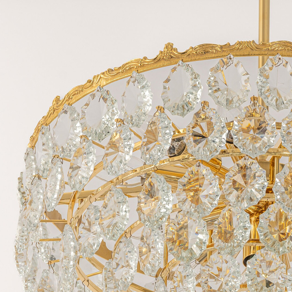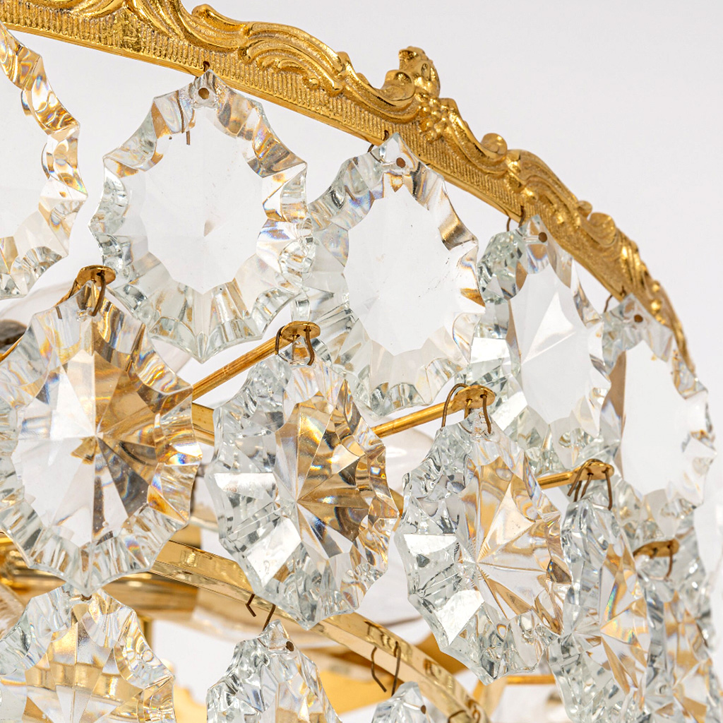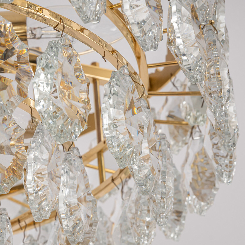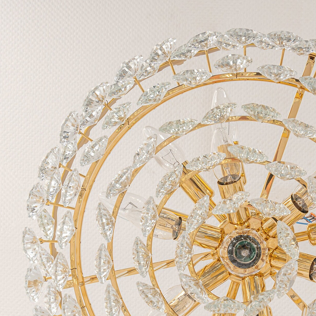 Oszałamiający sześciopoziomowy żyrandol marki Bakalowits & Söhne z Austrii, wyprodukowany w latach 1960-1969. Ręcznie wykonany z najwyższą starannością. Oprawa sufitowa i rama są ze złoconego mosiądzu, z sześcioma pierścieniami ozdobionymi licznymi fasetowanymi elementami z kryształowego szkła.