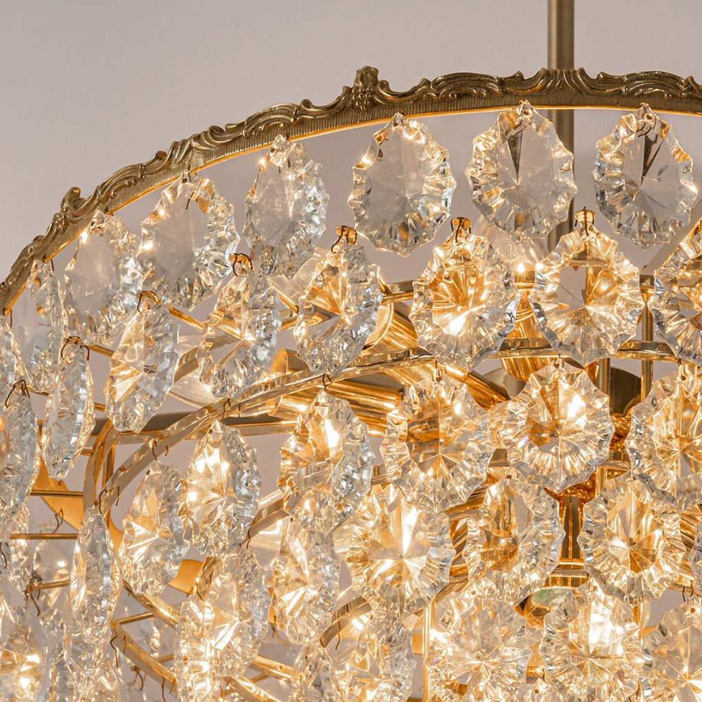 Żyrandol wyposażony jest w 15 gniazd na małe żarówki E14 (do 40 W każda) oraz jedno gniazdo na standardową żarówkę E27 (do 100 W). Żarówki nie są w zestawie.