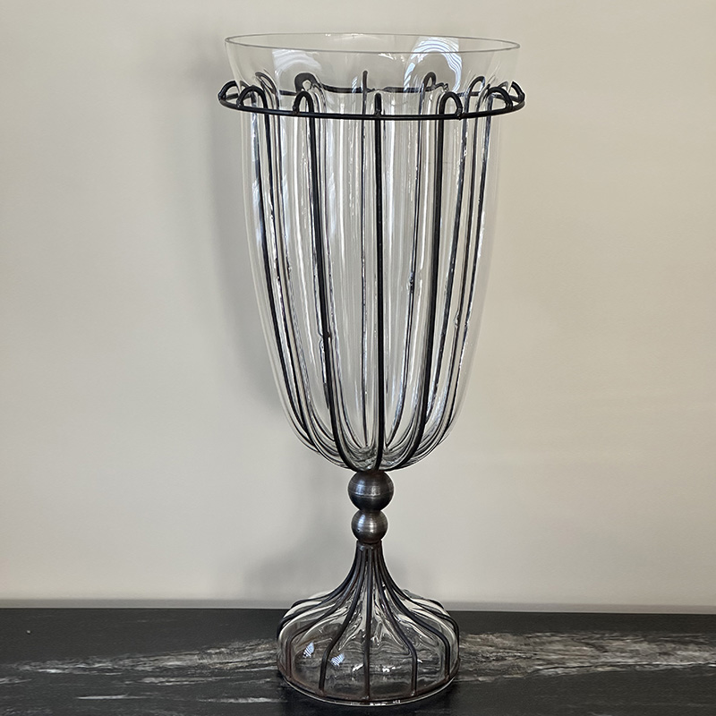 Wazon Murano, w technice szkła w stalowej klatce. Olbrzymi bo wysokość jego to aż 69 cm. Stopa wykonana również w technice dmuchanego szkła w klatce. Jedyny taki w Polsce. Najprawdopodobniej z lat 60 XX wieku.